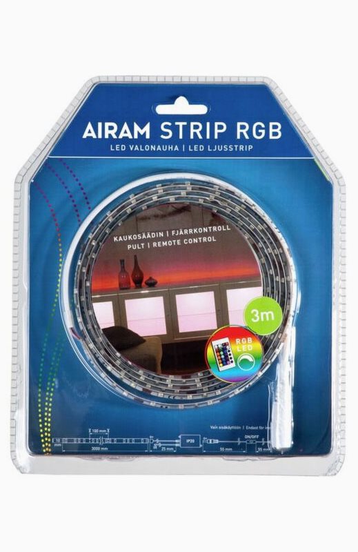 Airam LED-strip 3m IP20/54 RGB 2 12V 24W. 4107190. Dekorer hjemmet med lysbånd. Oppdag Airams LED-trip lys! Den tynne stripen gjør det mulig å lyse opp selv små områder som bokhyller, skap eller bord. Du kan klippe lyset til ønsket lengde med saks ved 5 cm trinn (med RGB båndet var 10cm). En rask og enkel Plug & Play installasjon. Du fester den enkelt på baksiden som er utstyrt med en teip. Den er beregnet for innendørs bruk. Leveres i en blisterpakning.
