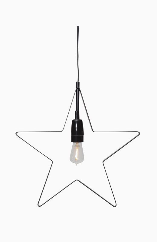 Svart metalstjerne med lampeholder av porselen fra Star Trading. I denne opphenget inneholder lyskilden en E14 LED-pære med varmt hvitt lys. Gir et stilig og moderne inntrykk. Heng stjerne i et vindu eller på et sted hvor du ønsker å skape den perfekte stemningen.