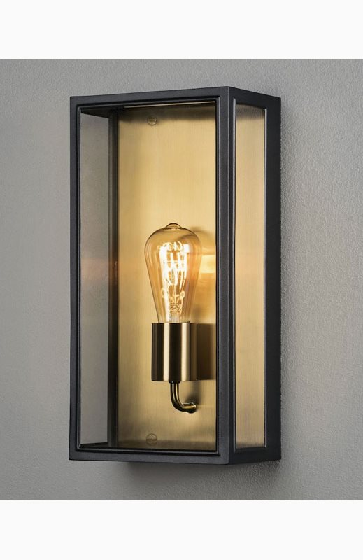 Konstsmide Carpi vegglampe E27 svart/messingfarged medium. En vakker vegglampe fra Konstsmide med store glasspartier. Disse vegglampene er utstyrt med en E27-sokkel og fungerer best for dekorative LED-lamper