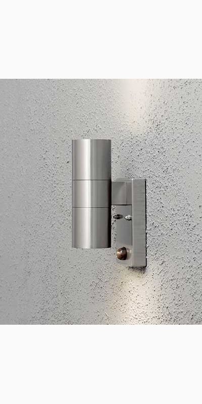 Modena vegglampe fra Konstsmides moderne serie. Lyser opp og ned. I rustfritt eller galvanisert stål, utstyrt med bevegelsesensor. Reagerer fra 2 meter, maks. 3 meter. Lyskilde IKKE inkludert. «Du finner GU10 LED-pærer her